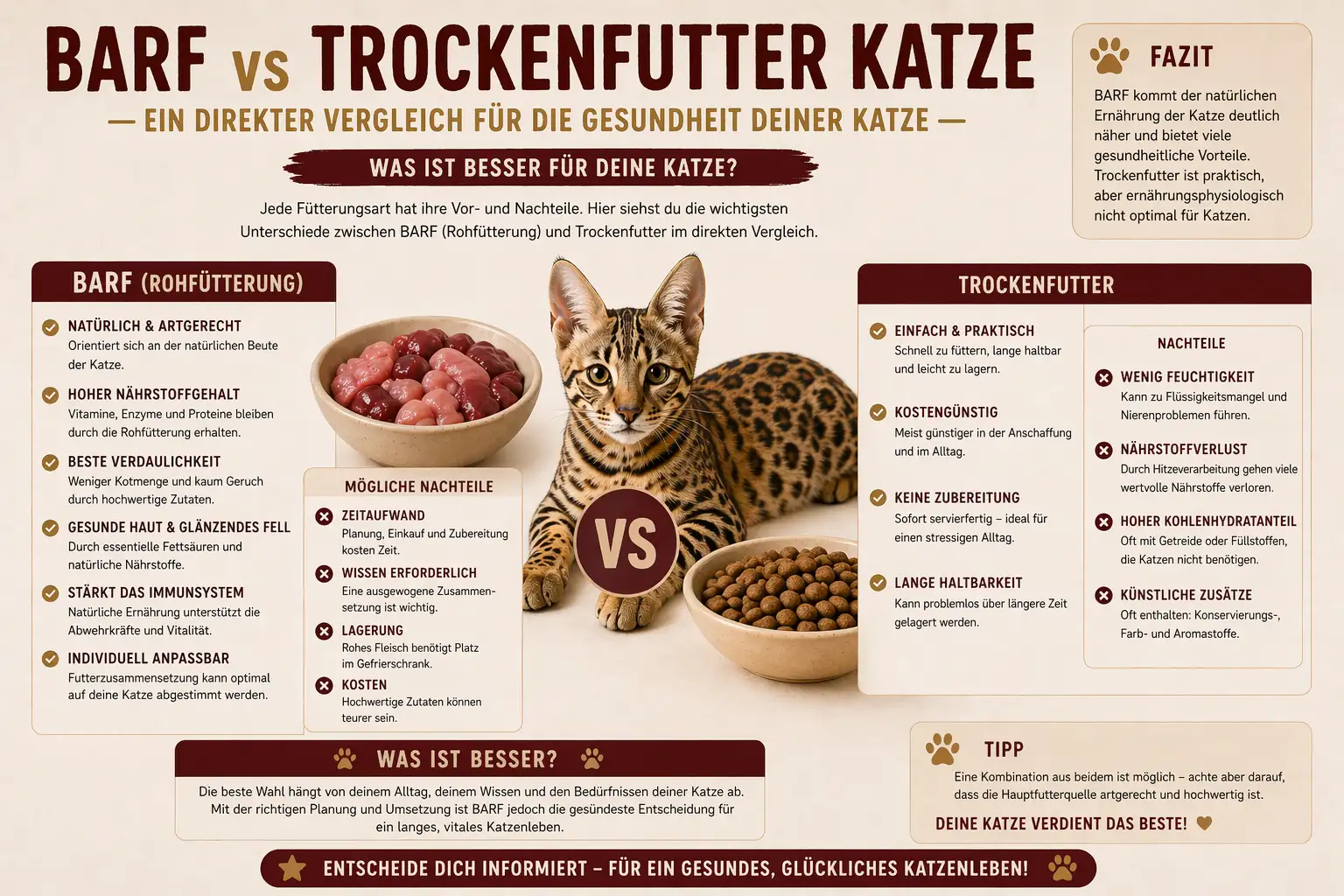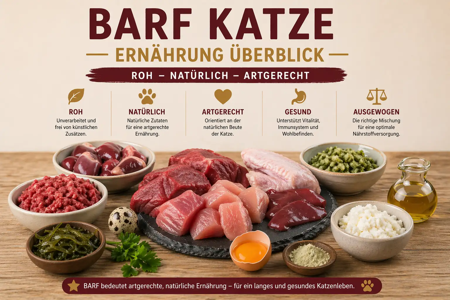 BARF beschreibt eine Fütterungsform für Katzen, bei der rohes Fleisch, Organe und gezielte Supplemente kombiniert werden, um eine natürliche Ernährung abzubilden.