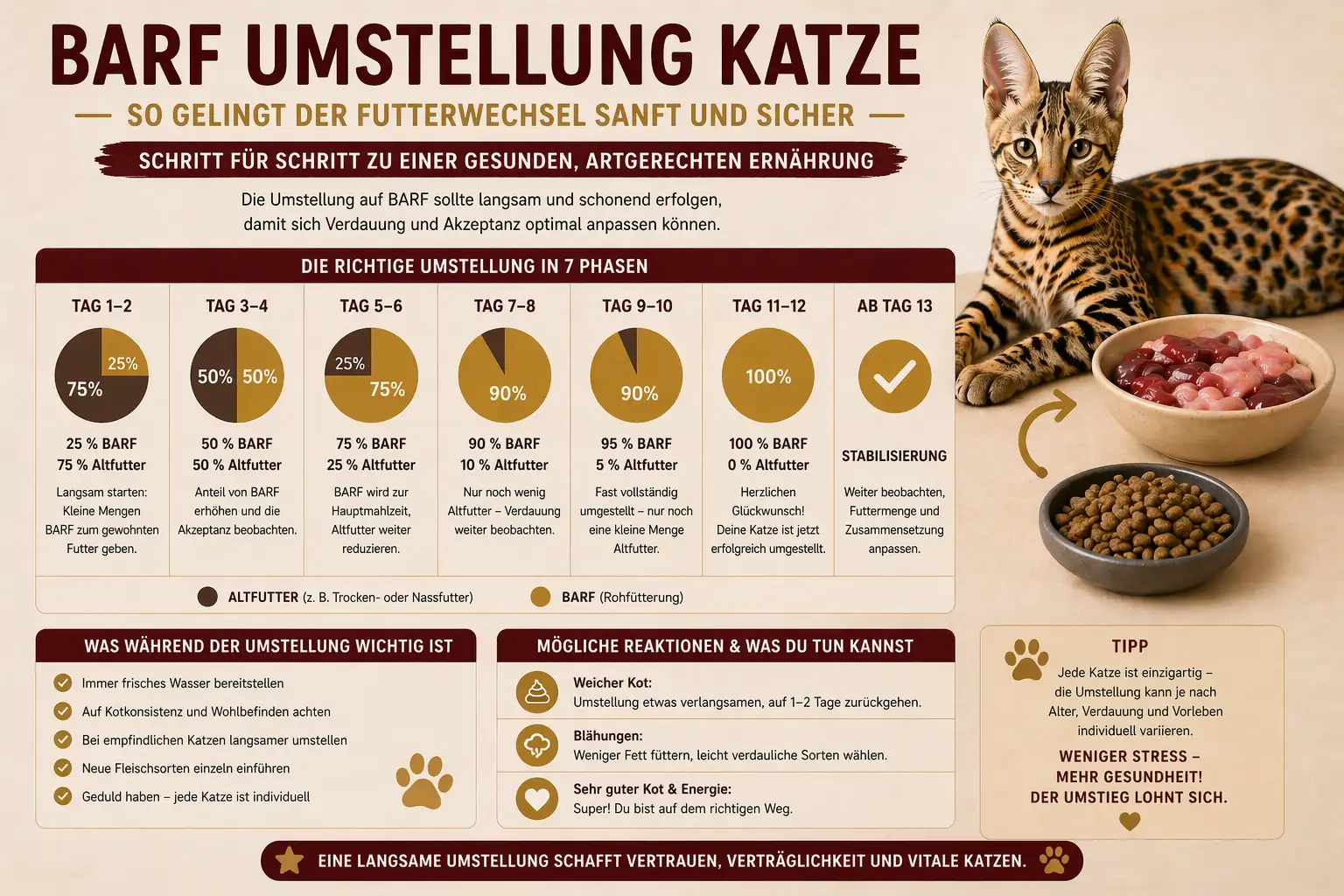 Die BARF Umstellung sollte schrittweise erfolgen, damit sich die Katze an die neue Ernährung gewöhnen kann.