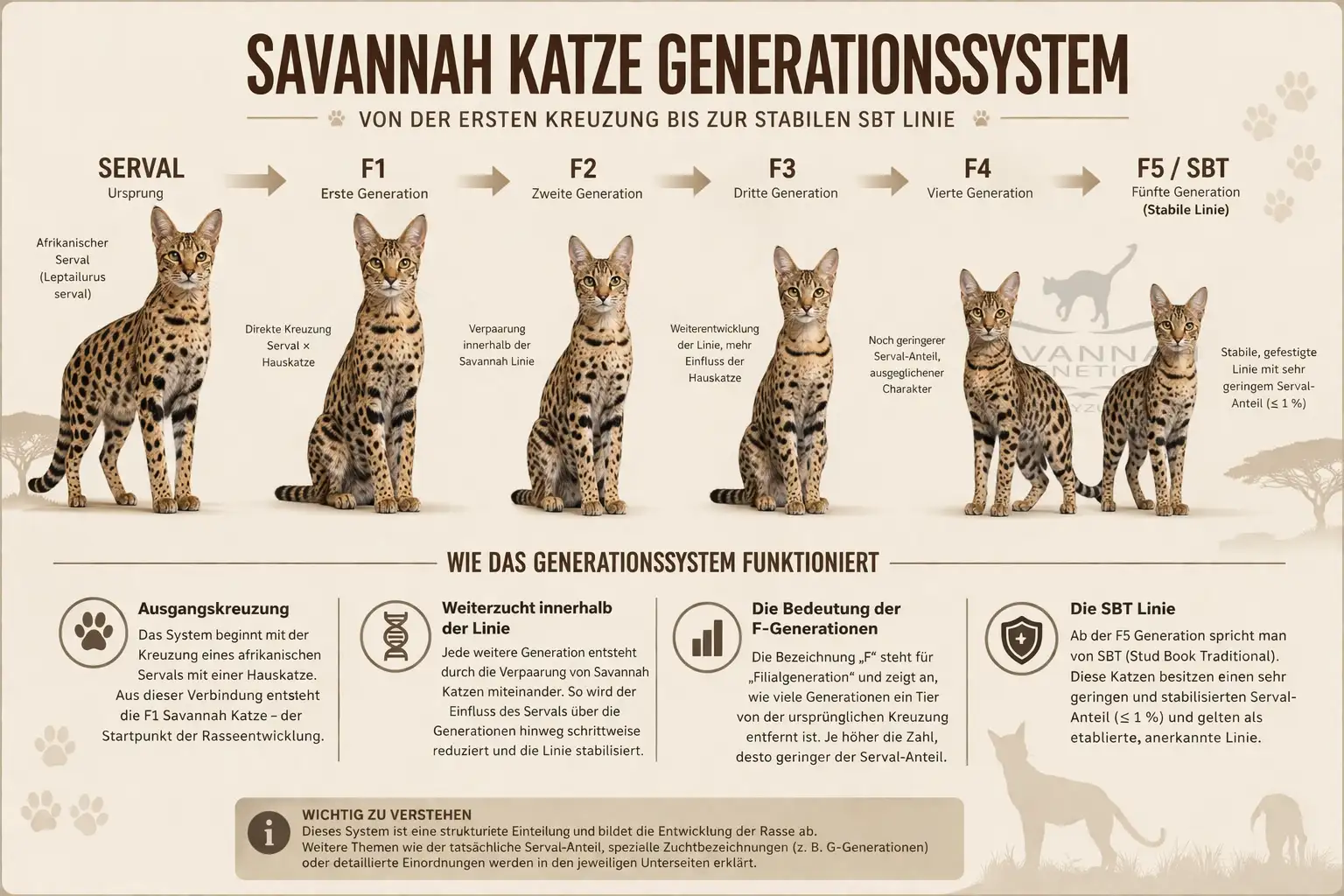 Savannah Katze Generationen sind die Grundlage, um diese besondere Hybridrasse überhaupt richtig einordnen zu können. Sie beschreiben die Abstammung der Tiere und zeigen, wie nah eine Savannah Katze noch mit dem afrikanischen Serval verwandt ist. Die bekannten Bezeichnungen reichen von F1 bis F7 bis hin zur SBT Savannah Katze, die eine stabile, über mehrere Generationen hinweg gefestigte Zuchtlinie darstellt.