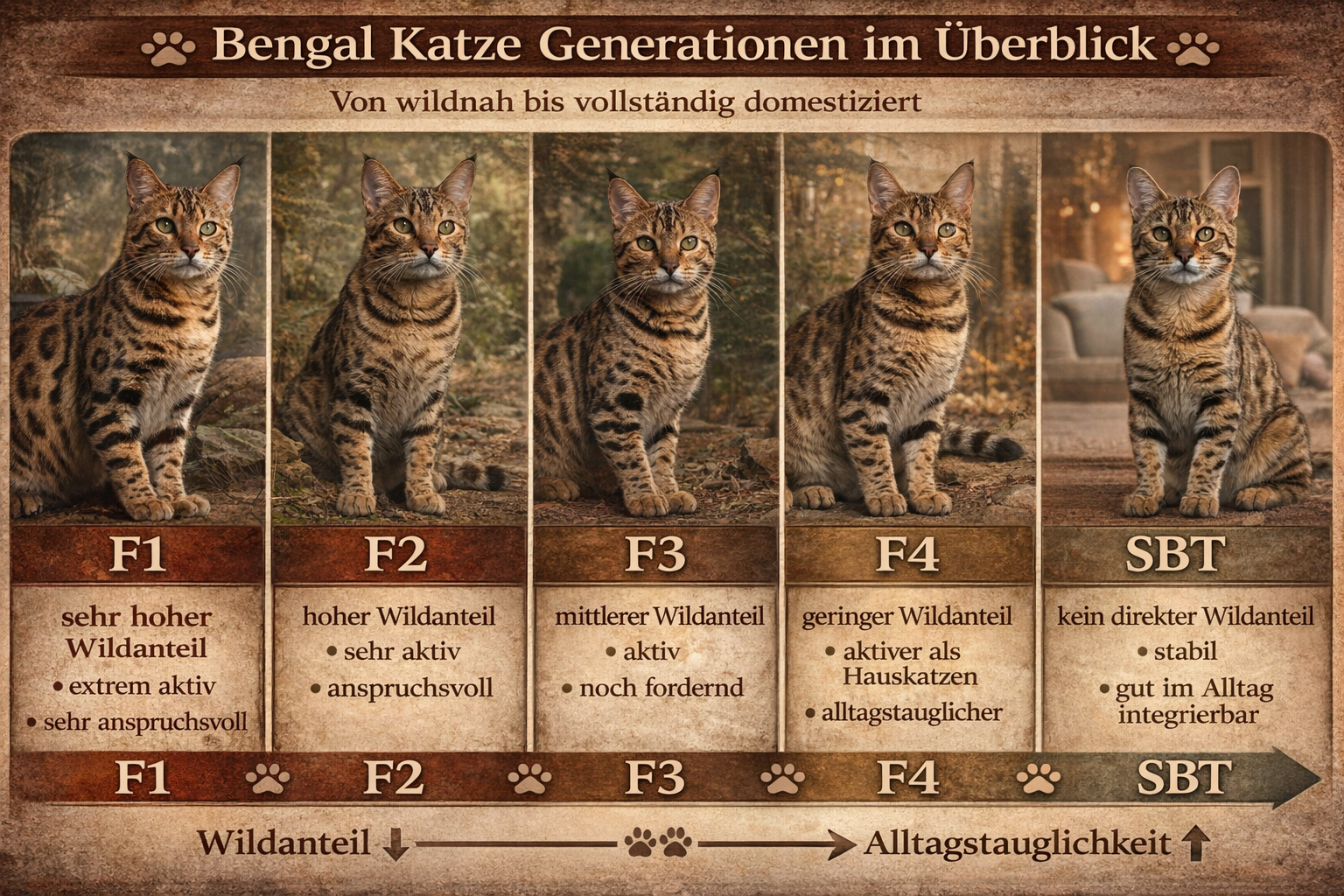 Die Einteilung in Generationen ist deshalb kein nebensächliches Detail, sondern eine zentrale Grundlage, um die Bengal Katze richtig einzuordnen. Viele Eigenschaften, die Halter als „typisch Bengal“ wahrnehmen, stehen in direktem Zusammenhang mit dem verbleibenden Wildtieranteil.