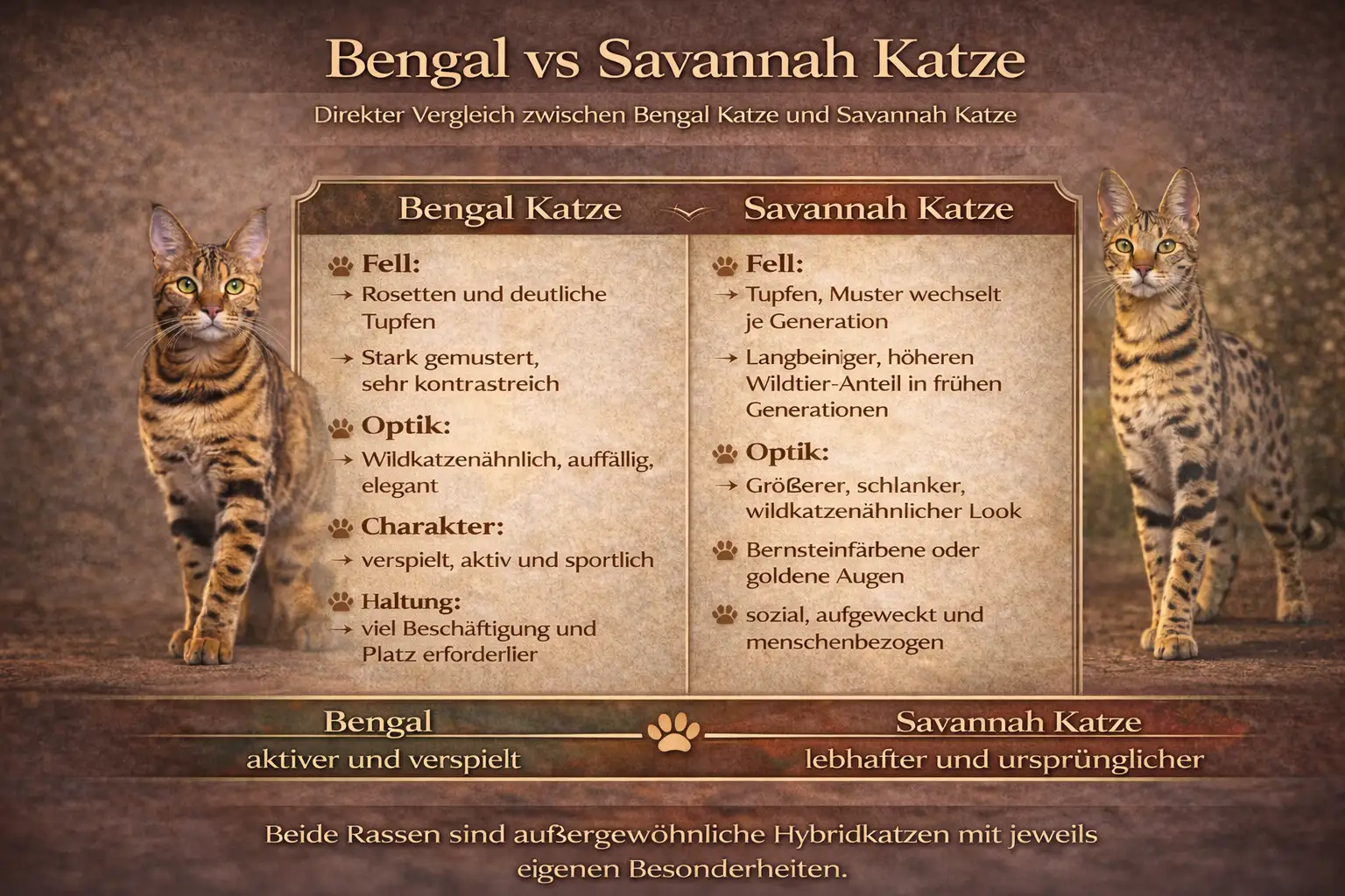 Wenn du die Unterschiede im Detail verstehen möchtest, findest du hier einen direkten Vergleich: Savannah Katze. Dort werden Eigenschaften, Verhalten und Haltung umfassend erklärt.