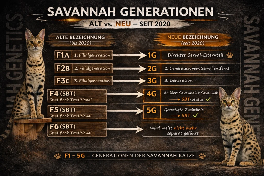 Diese Generationen werden mit den Bezeichnungen F1, F2, F3, F4 und F5 beschrieben. Sie geben an, wie nah ein Tier genetisch noch am Serval steht und wie stark die ursprüngliche Kreuzung in der jeweiligen Linie sichtbar ist.