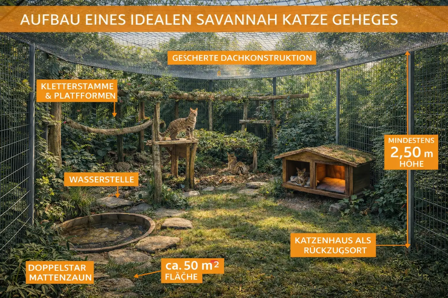 Ein entscheidender Punkt ist die vollständige Überdachung. Ohne Dach kann ein Serval das Gehege überwinden, da seine Sprungkraft oft unterschätzt wird.