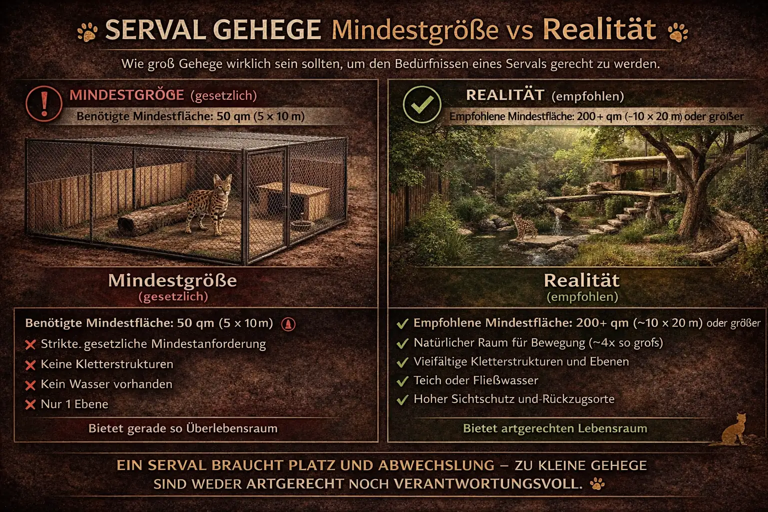Die Größe eines Serval Geheges wird häufig unterschätzt. Während gesetzliche Mindestanforderungen bei etwa 25 m² Außenfläche und 15 m² Innenbereich beginnen, zeigt die Praxis ein deutlich anderes Bild.