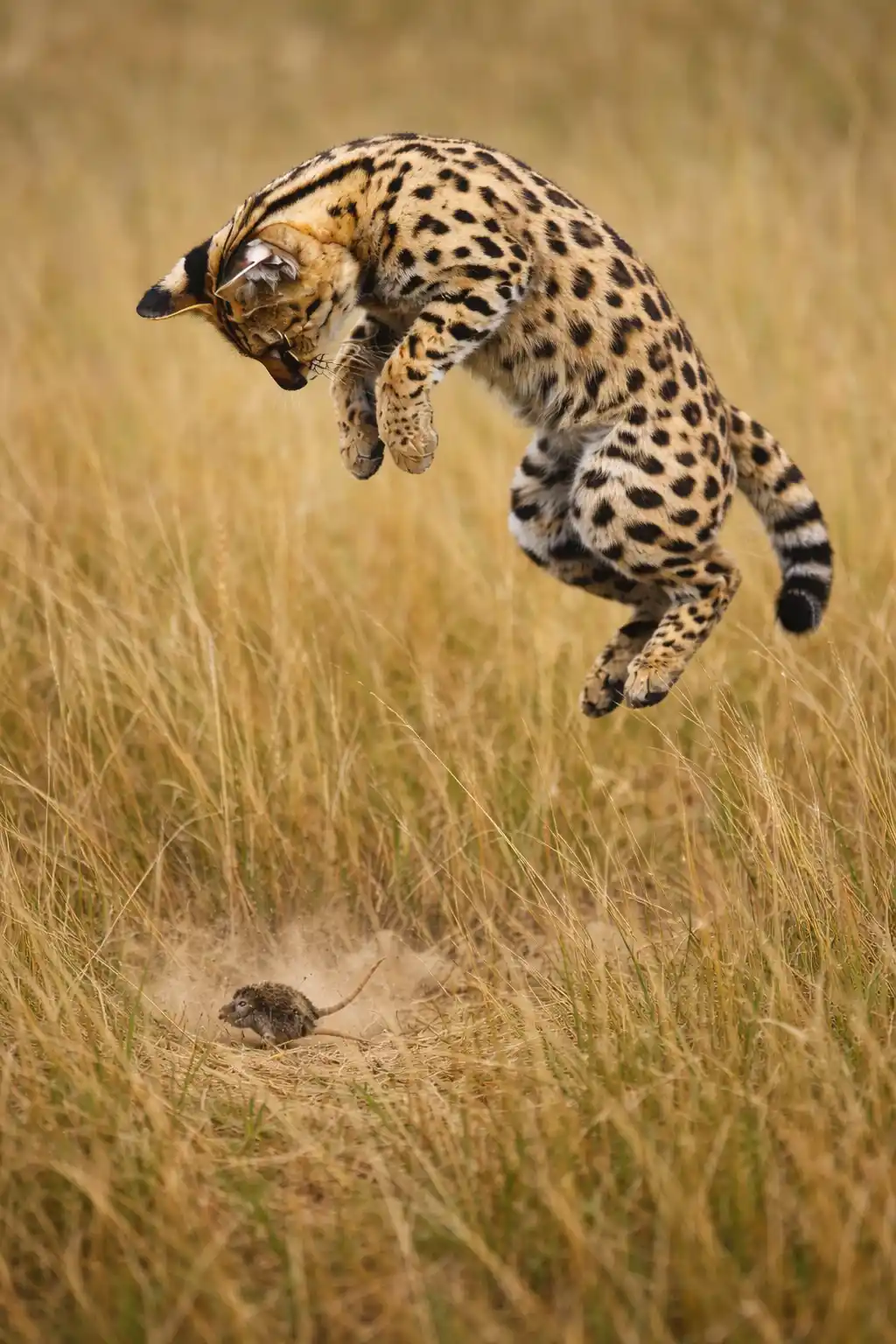 Diese Sprungkraft ermöglicht es ihm, Beute im hohen Gras gezielt zu treffen.